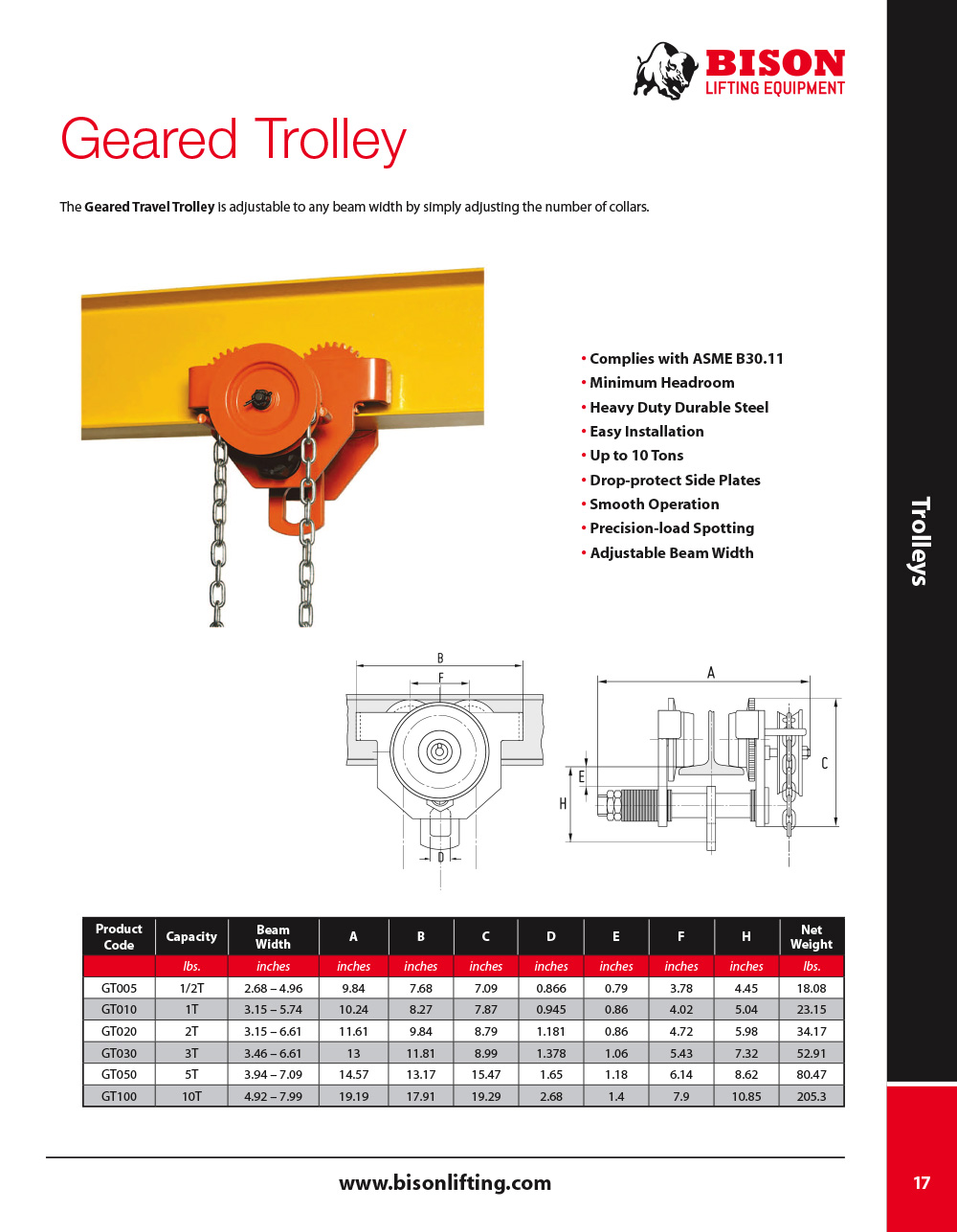 • Complies with ASME B30.11• Minimum Headroom• Heavy Duty Durable Steel• Easy Installation• Up to 10 Tons• Drop-protect Side Plates• Smooth Operation• Adjustable Beam Width