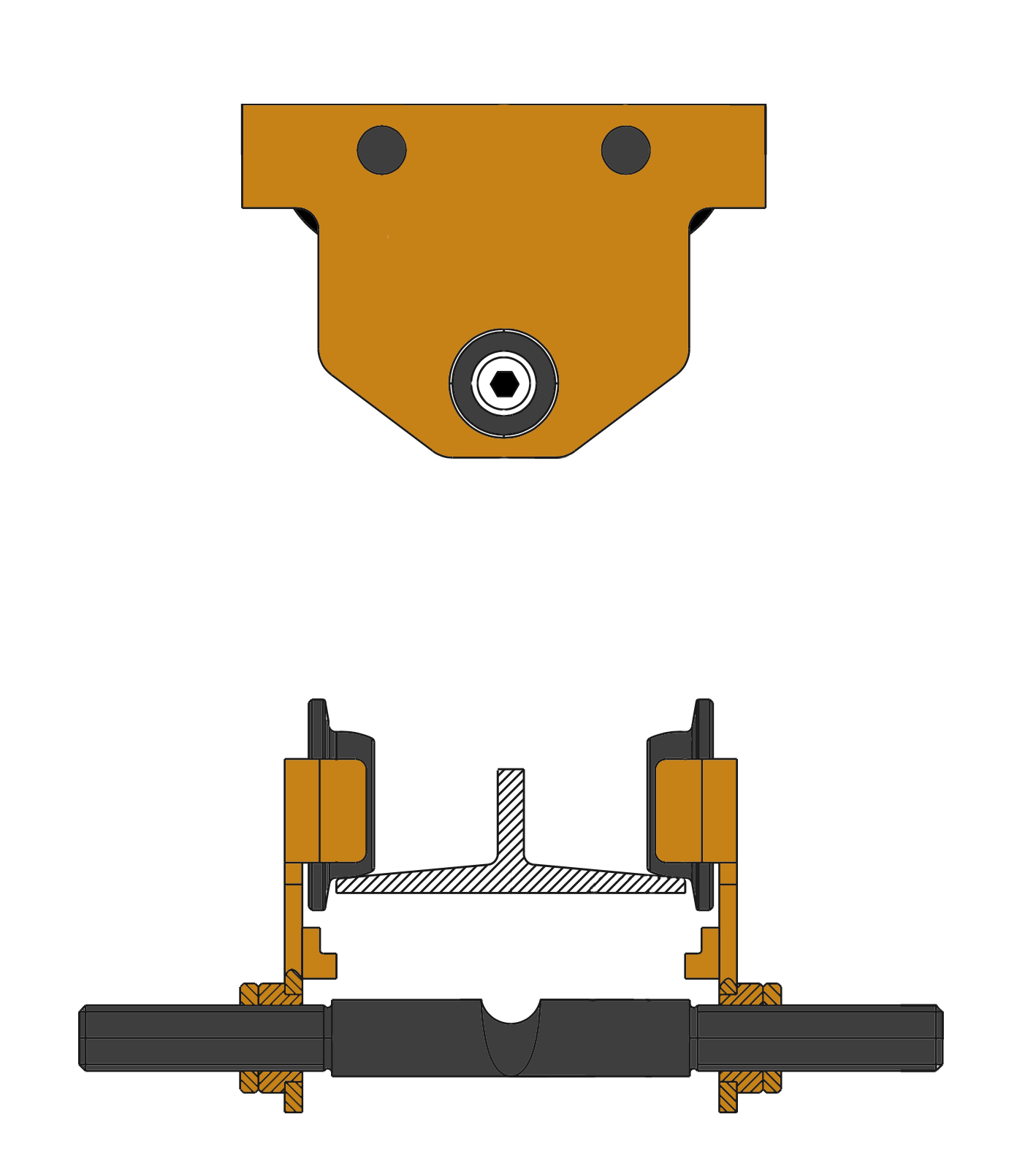 Threaded shaft with Allen bit setting. Makes opening and closing the trolley to fit a beam ultra quick and convenient. Using a drill fitted with an Allen bit, simply work the trolley open and closed. Removes the need for collars/ spacers. This design provides best in class headroom and accommodates wider beam flanges.