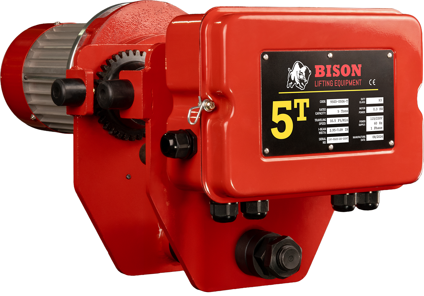 The Bison sinlge phase motorized trolleys are universal to all hoists. The trolley can be controlled indepently through its own pendant crontroller. Only hoists with 24V control can be wired into the motorized trolley to be operated all through one pendant.