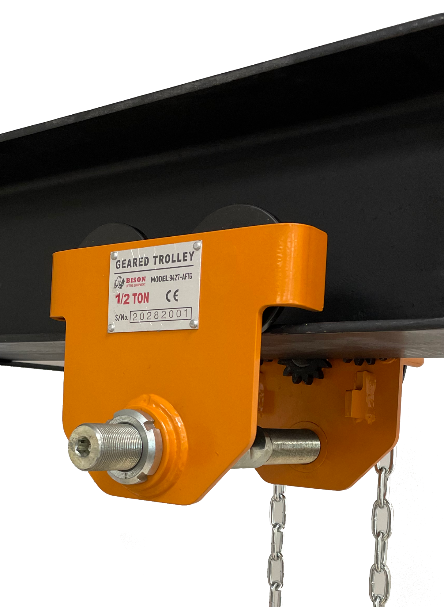 Threaded shaft with Allen bit setting. Makes opening and closing the trolley to fit a beam ultra quick and convenient. Using a drill fitted with an Allen bit, simply work the trolley open and closed. Removes the need for collars/ spacers. This design provides best in class headroom and accommodates wider beam flanges.